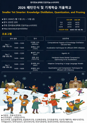 한국정보과학회 인공지능소사이어티에서는 2026년 2월 11일(수)부터 13일(금)까지 3일 동안, "2026년 패턴인식 및 기계학습 겨울학교"를 온라인으로 개최합니다. 이번 겨울학교에서는 "Smaller Yet Smarter: Knowledge Distillation, Quantization, and Pruning"이라는 주제로 모델 압축·경량화 방법론에 대해 심도있게 공부하는 시간을 마련했습니다. 국내 최고 권위의 연사들이 주제 관련 최신 연구와 동향을 소개합니다. 학교 정규 과정에서 다루지 못한 내용을 습득하고 빠르게 변화하는 기계학습/딥러닝 학습기법에 대한 통찰을 얻을 수 있는 훌륭한 기회가 될 것으로 기대합니다.